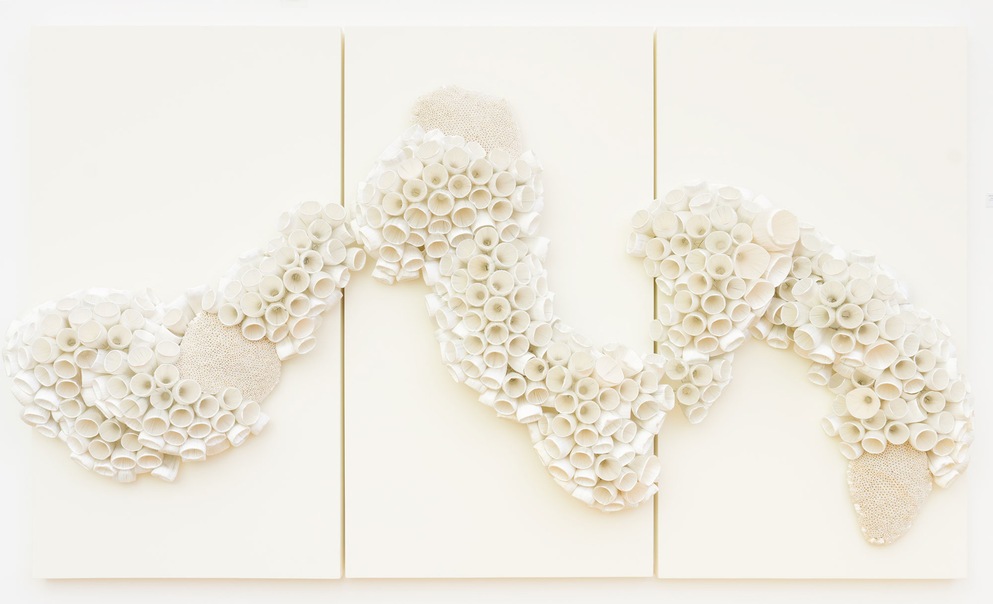 Silk, plastic bottles and plastic tubes on wire frame and wooden plate