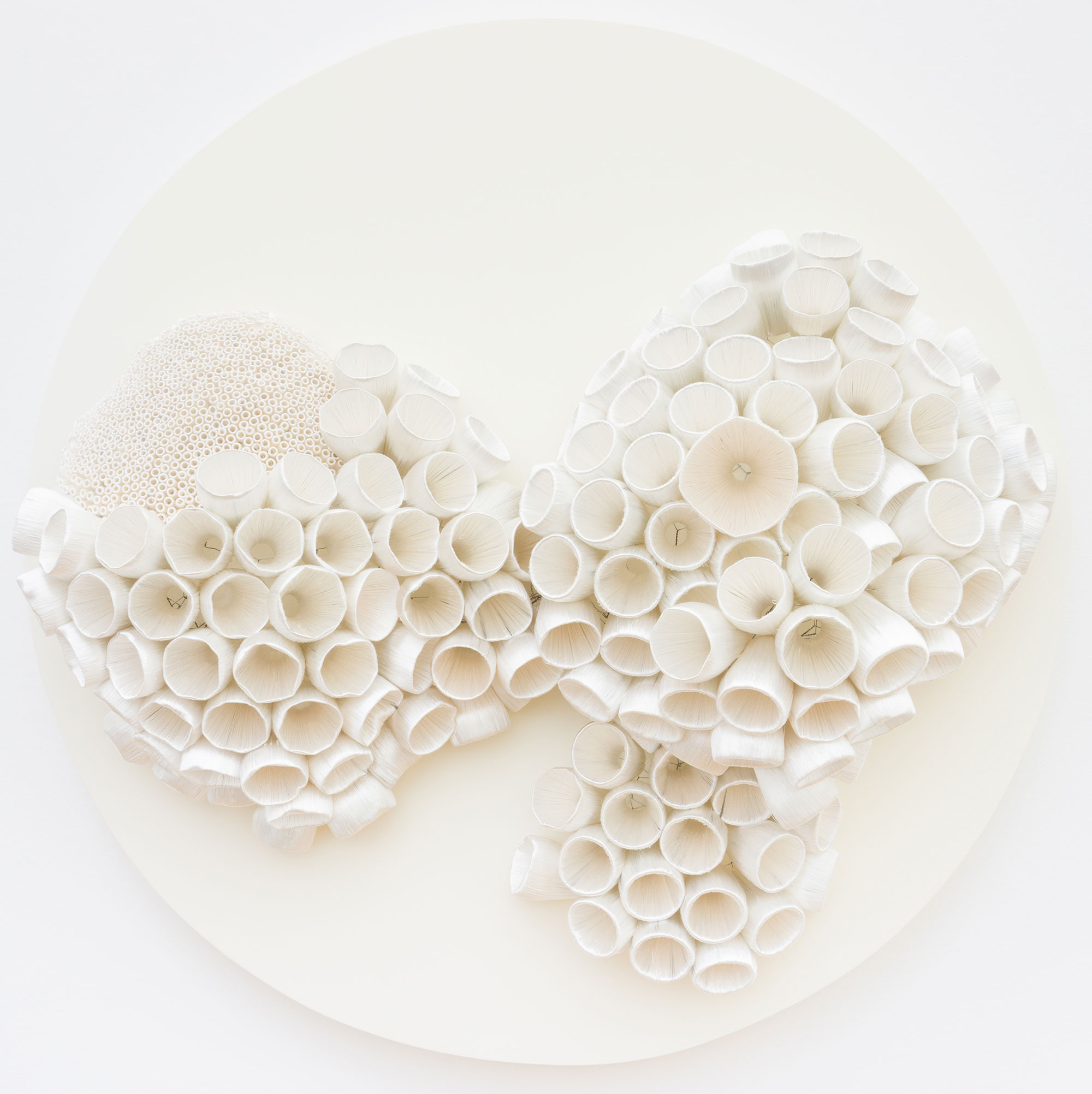 Silk, plastic bottles and plastic tubes on wire frame and wooden plate
