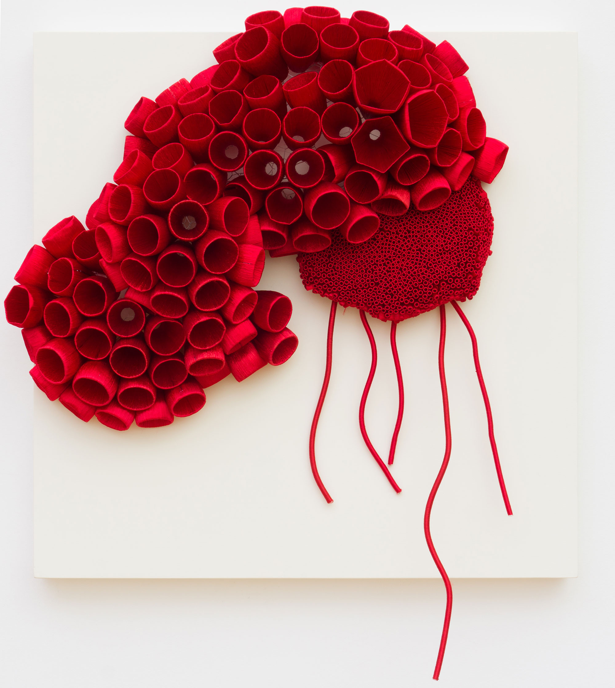Silk, plastic bottles and plastic tubes on wire frame and wooden plate