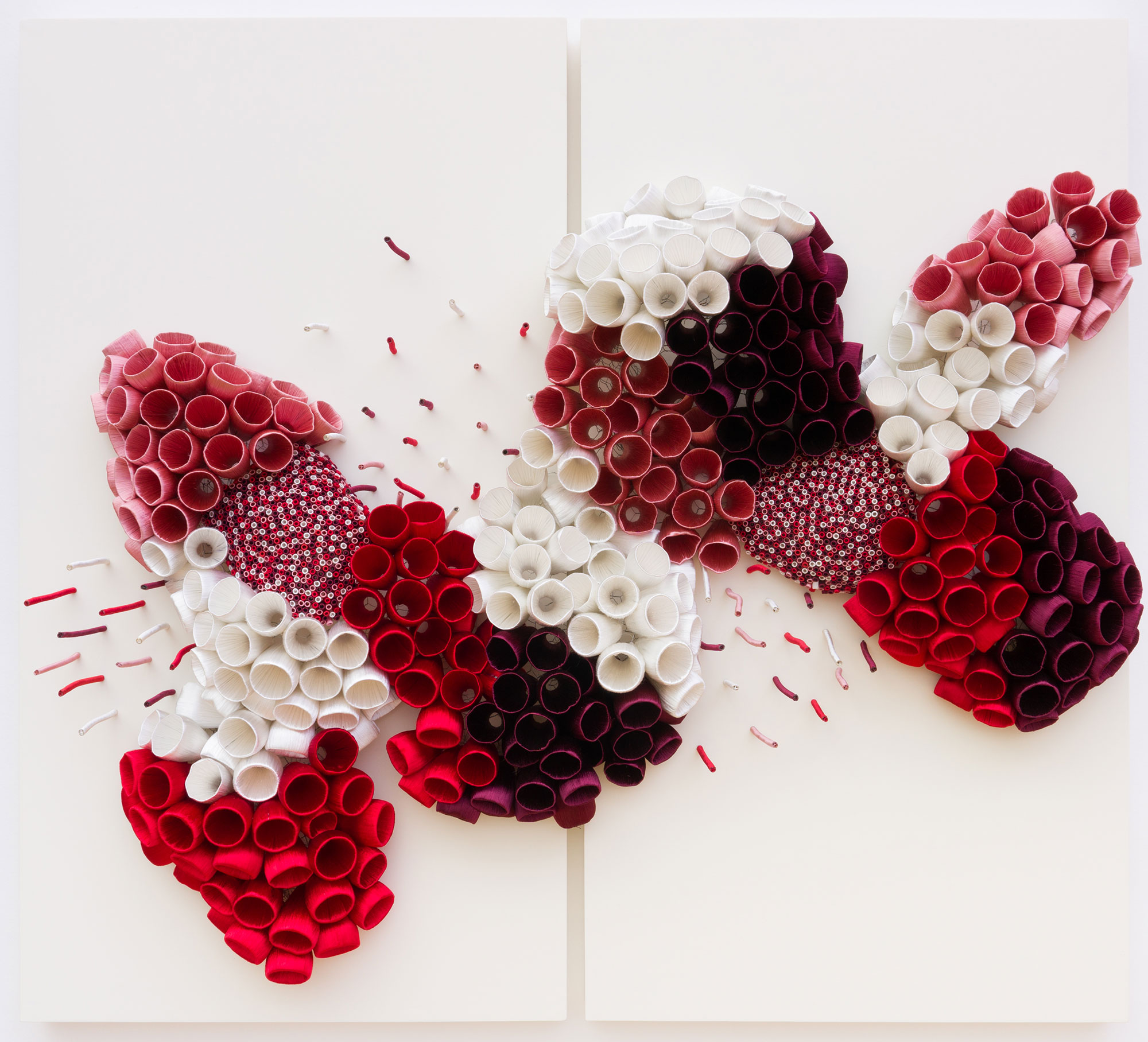 Silk, plastic bottles and plastic tubes on wire frame and wooden plate