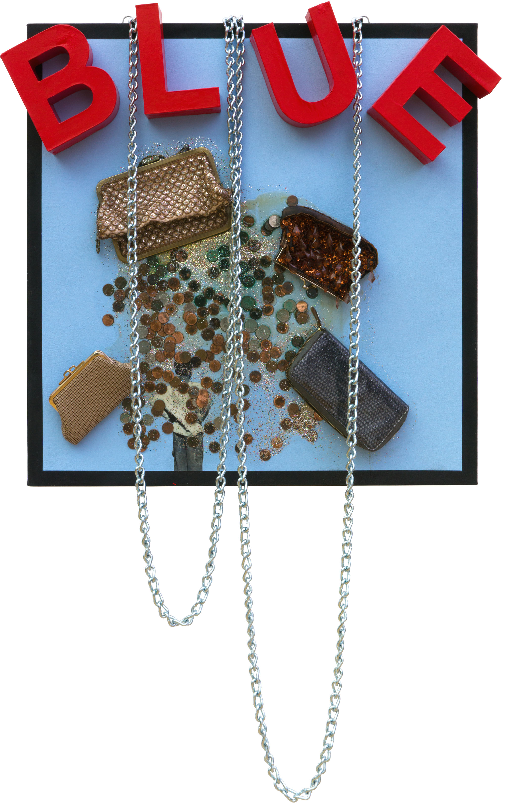Cardboard letters, various handbags, coins, glitter, collage and acrylic on canvas