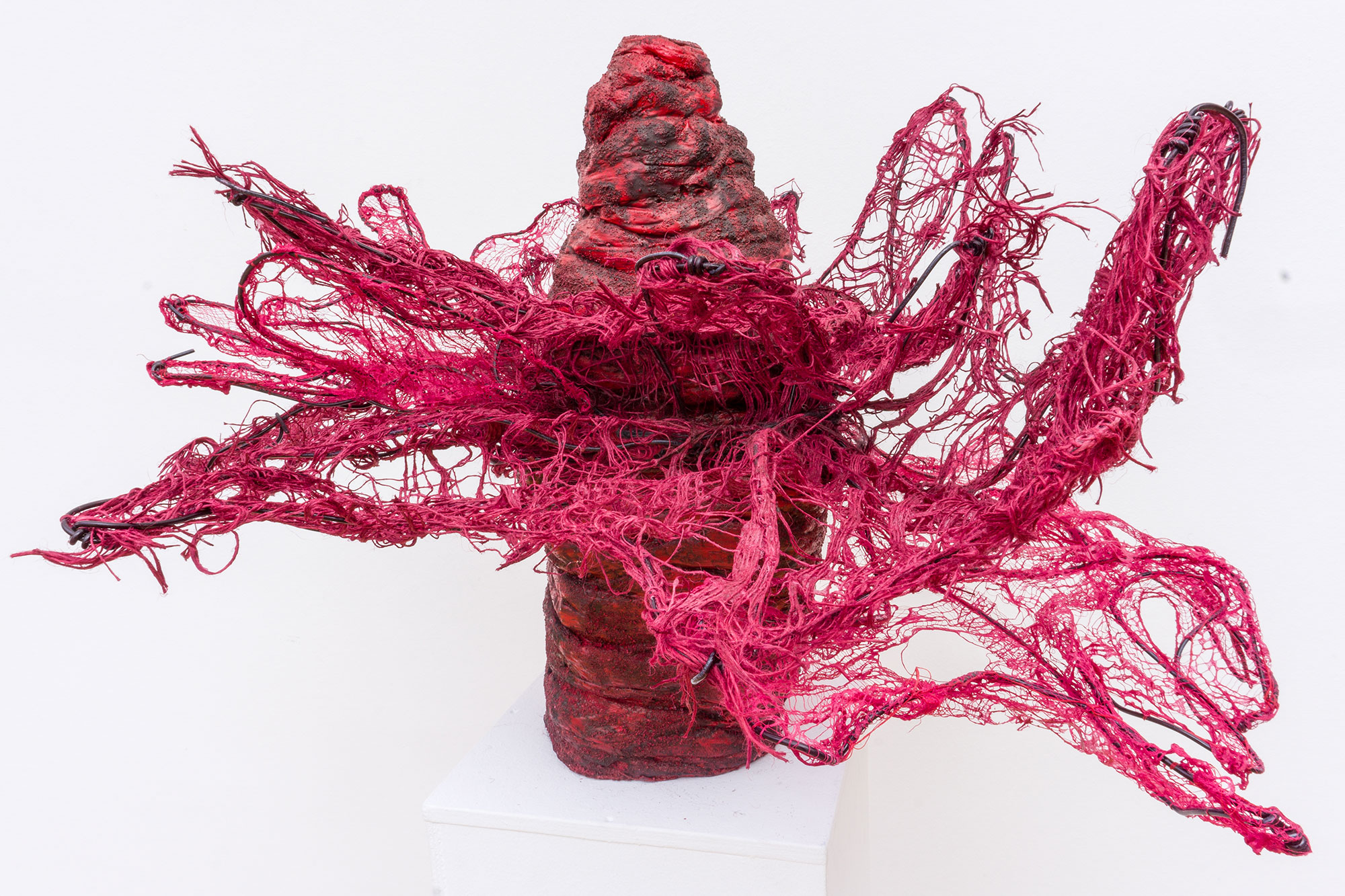 Burlap, cheese cloth, paper, dye, acrylic and wire