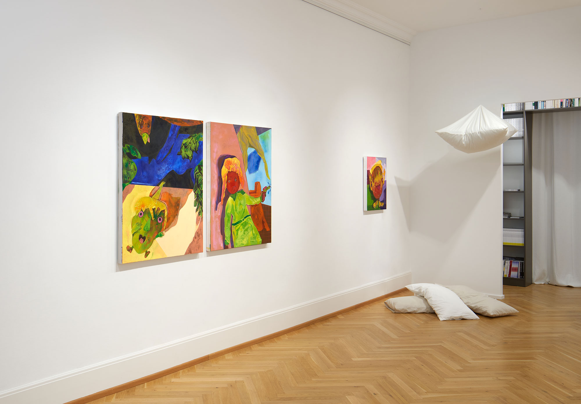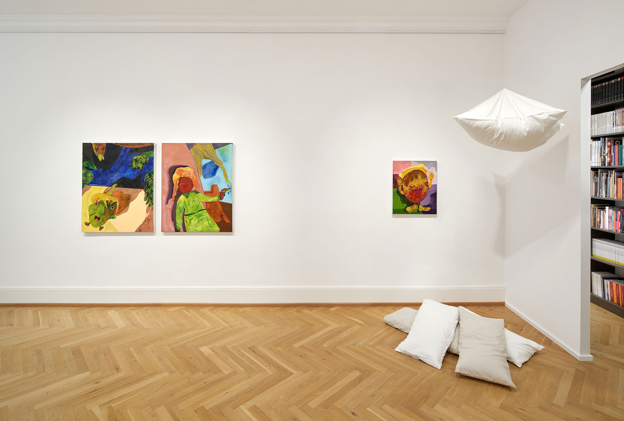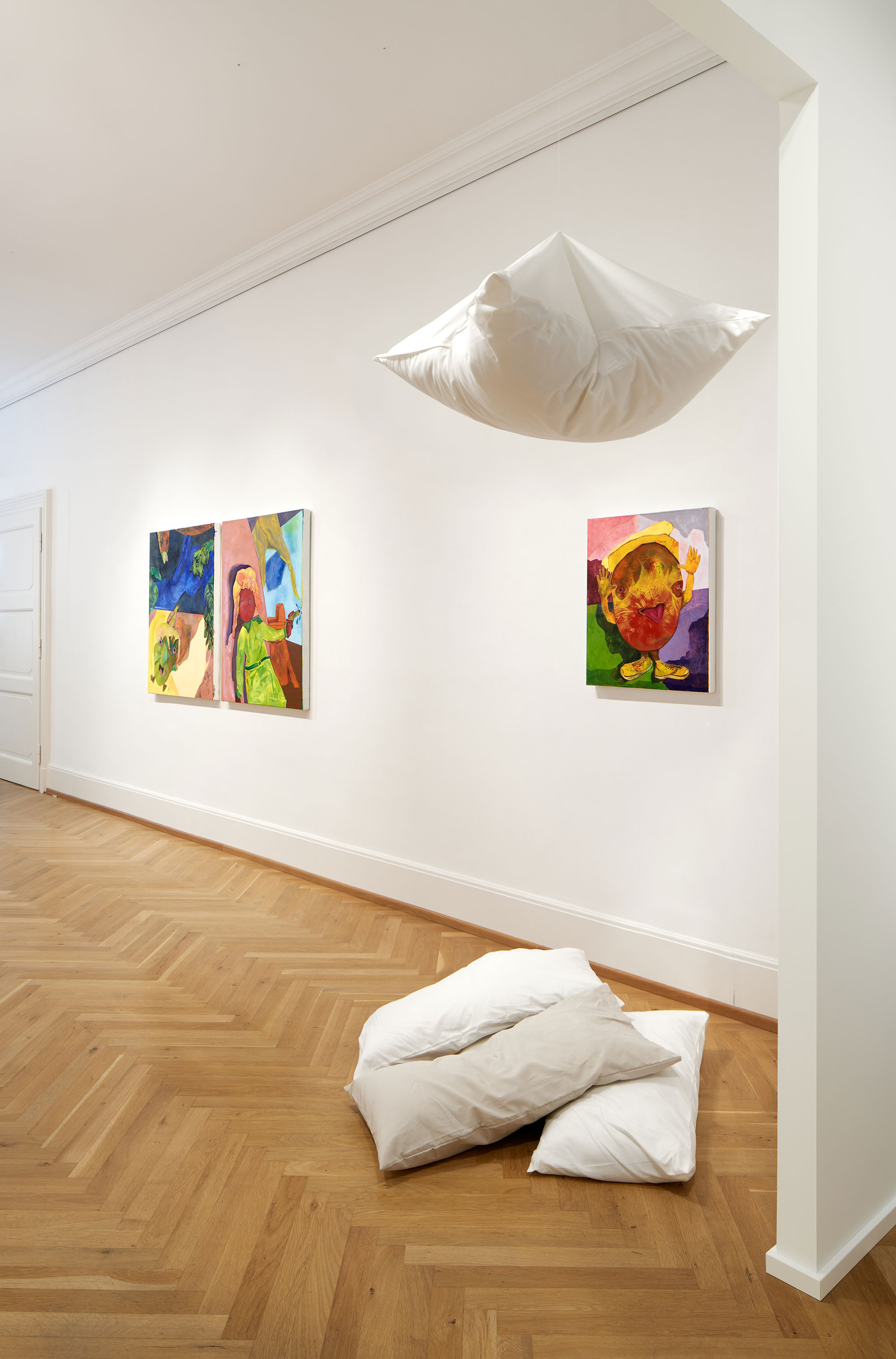 The exhibition space includes an installation of pillows beneath a cloudy canopy, inviting visitors to immerse themselves in Elhassan's sonic memories. A sound piece fills the room with her mother's lullabies, squeaky toys, and the soft thud of pillow fights, creating a multisensory experience that bridges the artist’s past and present.