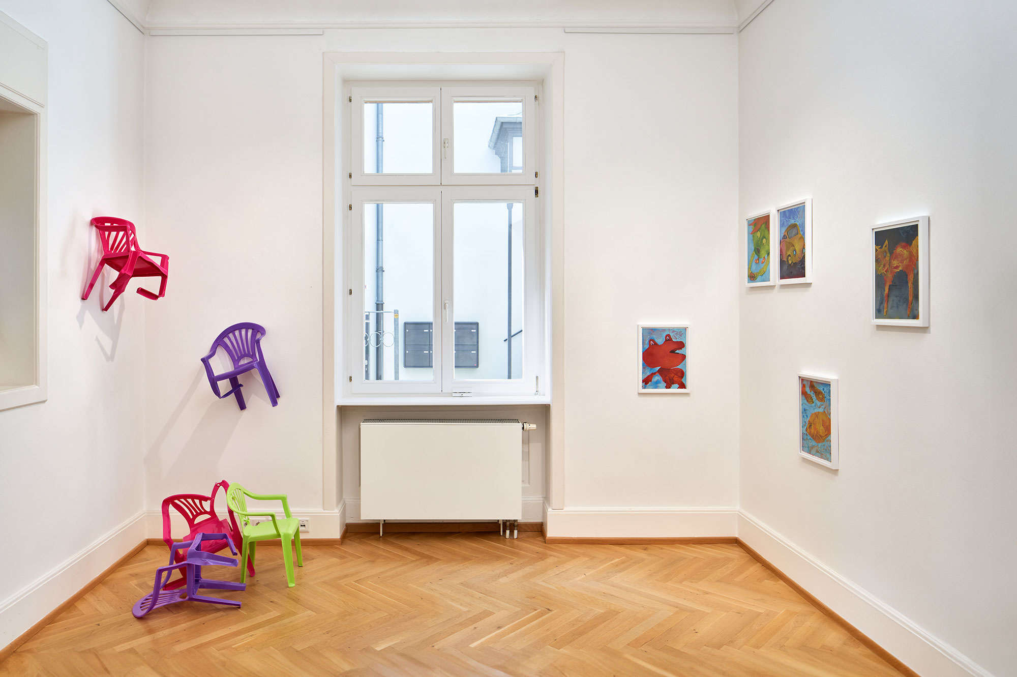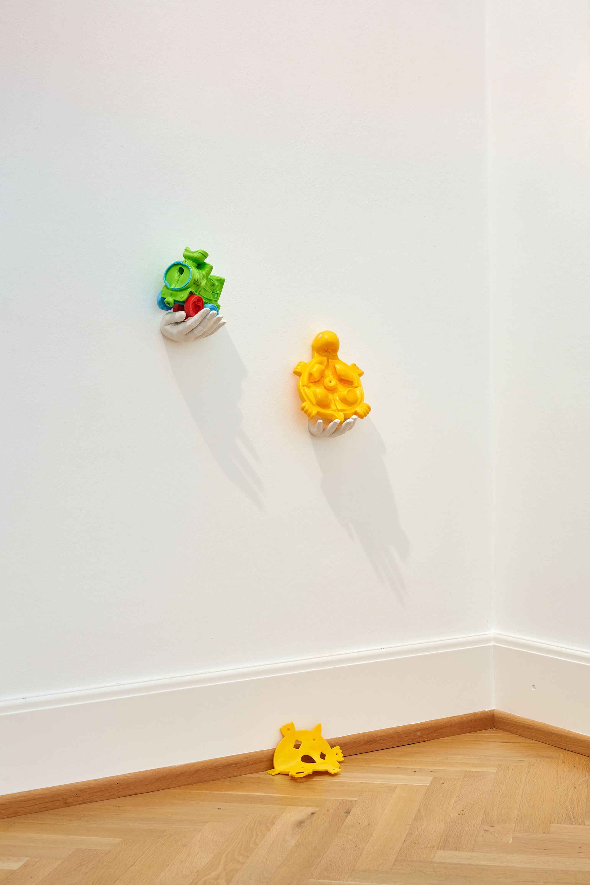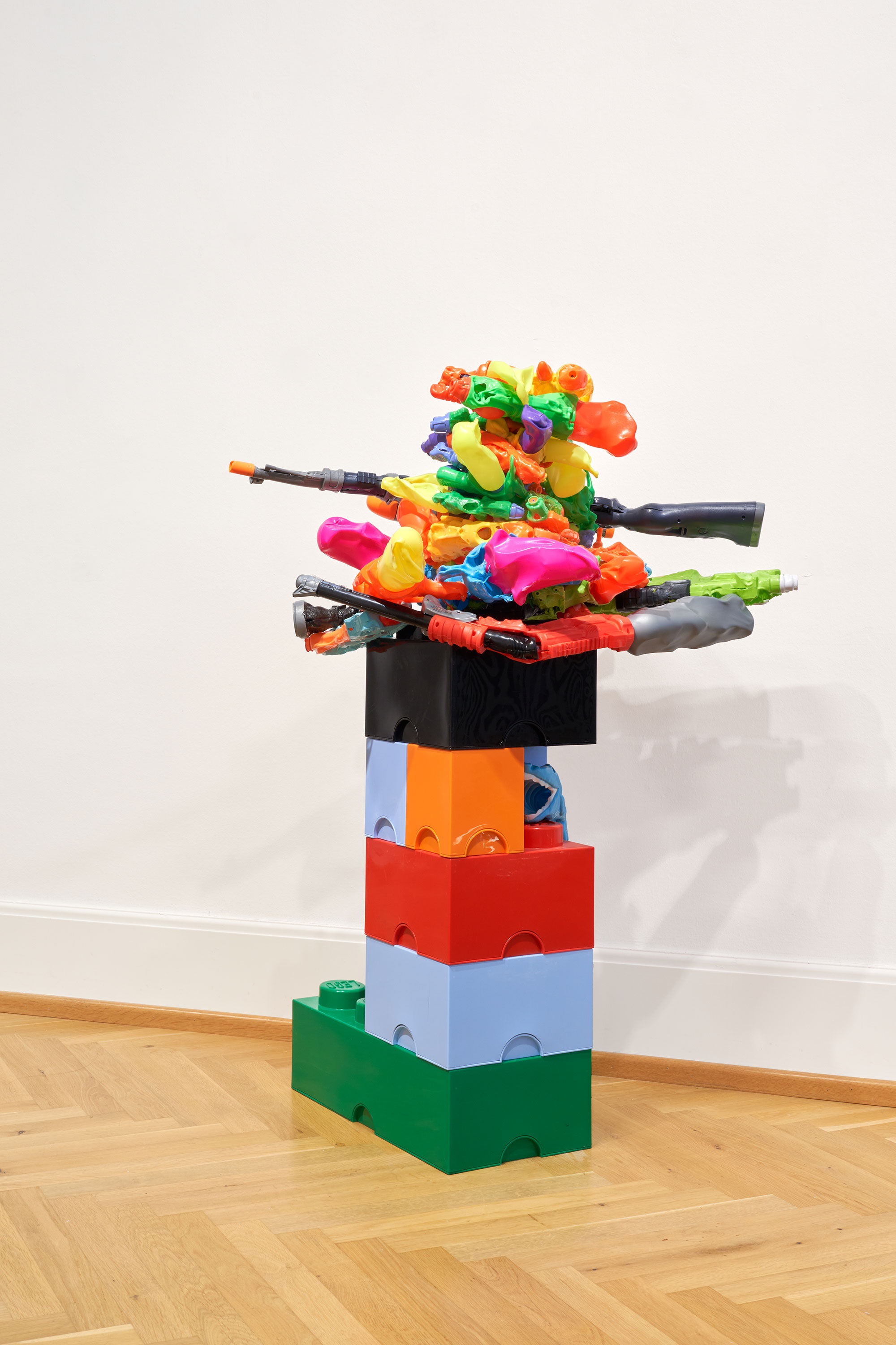 Elhassan's sculptures offer a thought-provoking commentary on the nature of children's games. A pile of melted plastic water guns on a lego pedastal serves as a metaphor for the parallels between war and plastic - both harmful yet chosen and financed by society. Another sculpture features destroyed plastic children's chairs, alluding to the popular game of musical chairs and questioning the competitive, often violent narratives embedded in children's play.