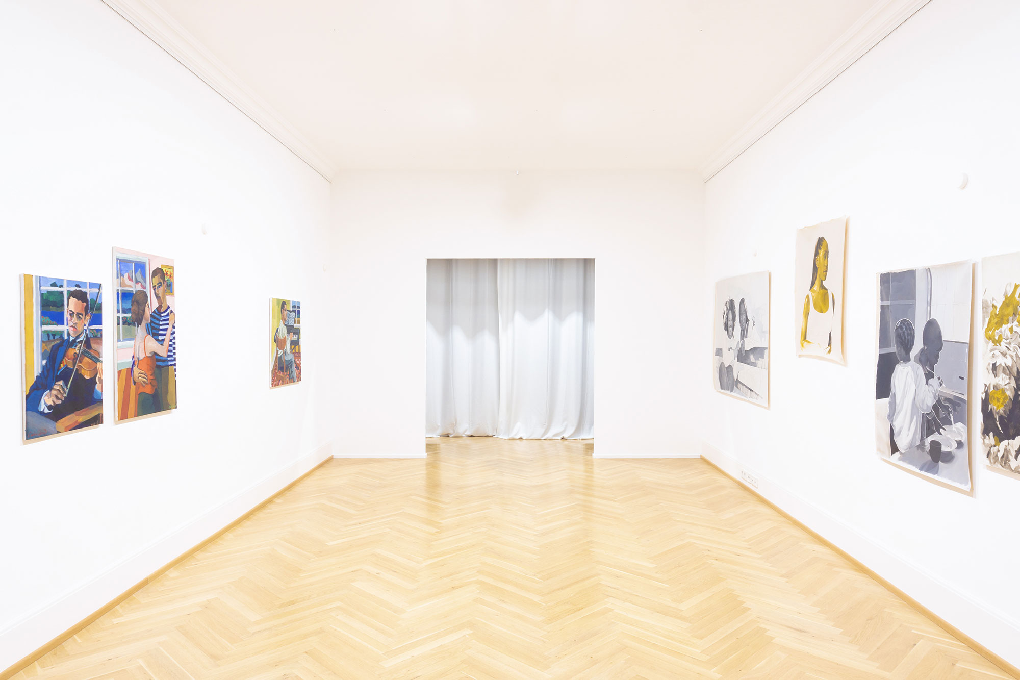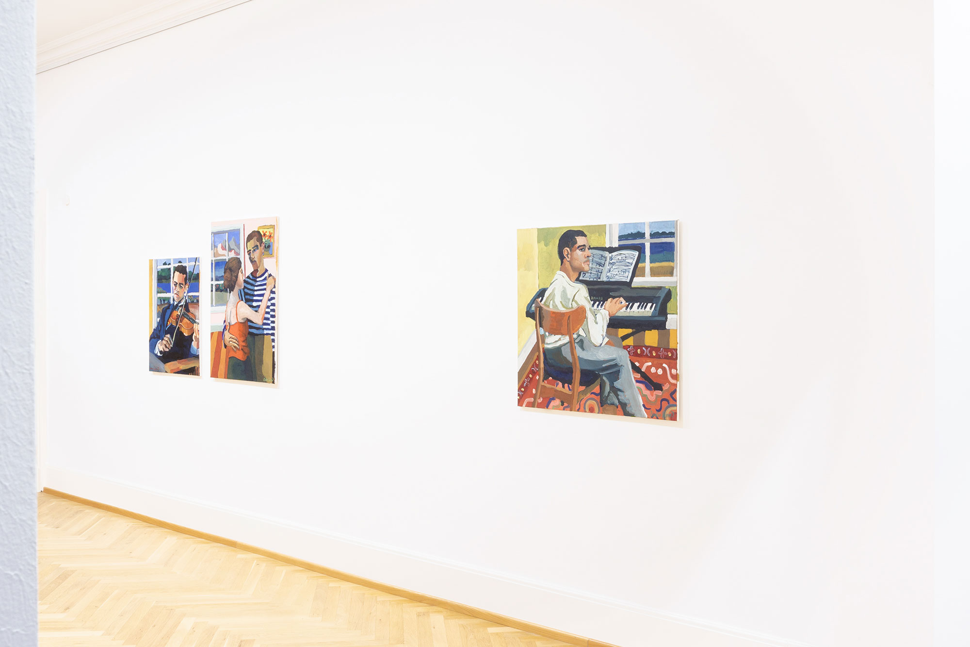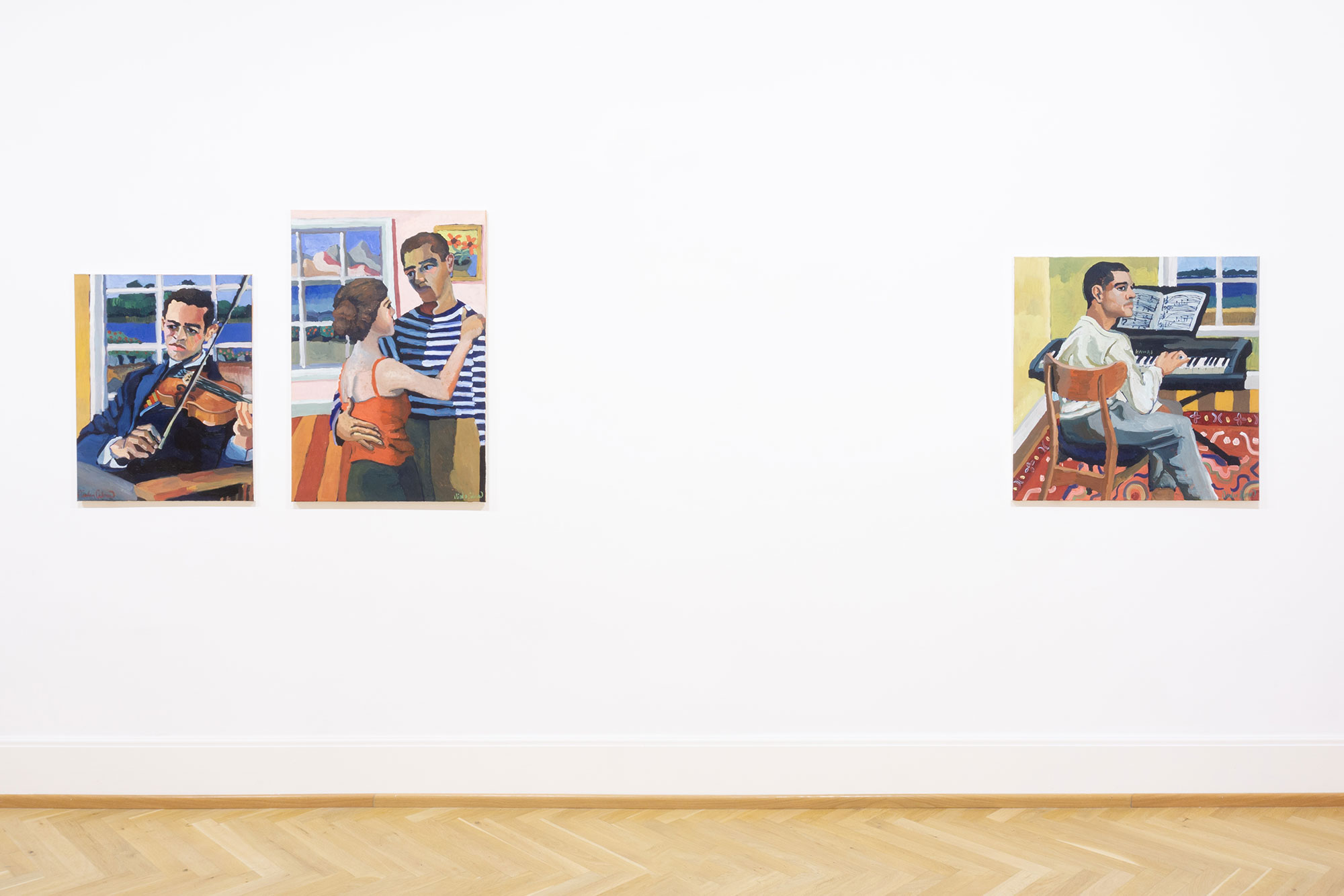 The paintings by Nicolas Coleman center around music and summertime. The compositions all include figures in an interior space with a window looking out to a different landscape: mountains, gardens, and the blues of water and skies. These spaces and settings are all imagined but draw inspiration from Coleman’s recent travels across the United States and to the South of France. Mirroring the theme of music, the artist created compositions that are lyrical, bright, and expressive while simultaneously including elements of melancholy in the expressions of the figures. With the juxtaposition of interior and exterior, bright jovial colors, and the figures’ somber expressions, the music and dancing captured in the still images harken to the fragmented and yet inter-connected ways that we reconstruct our memories of the people, places, and things we have encountered.