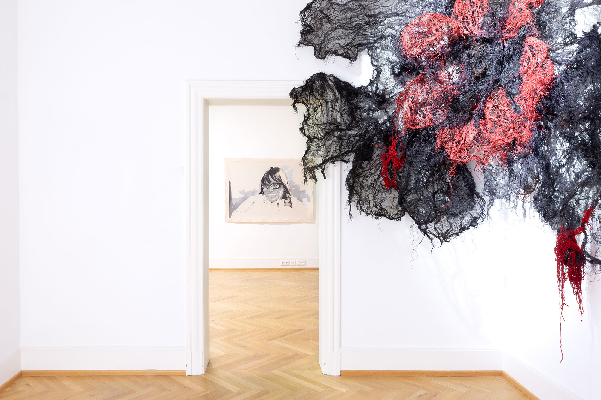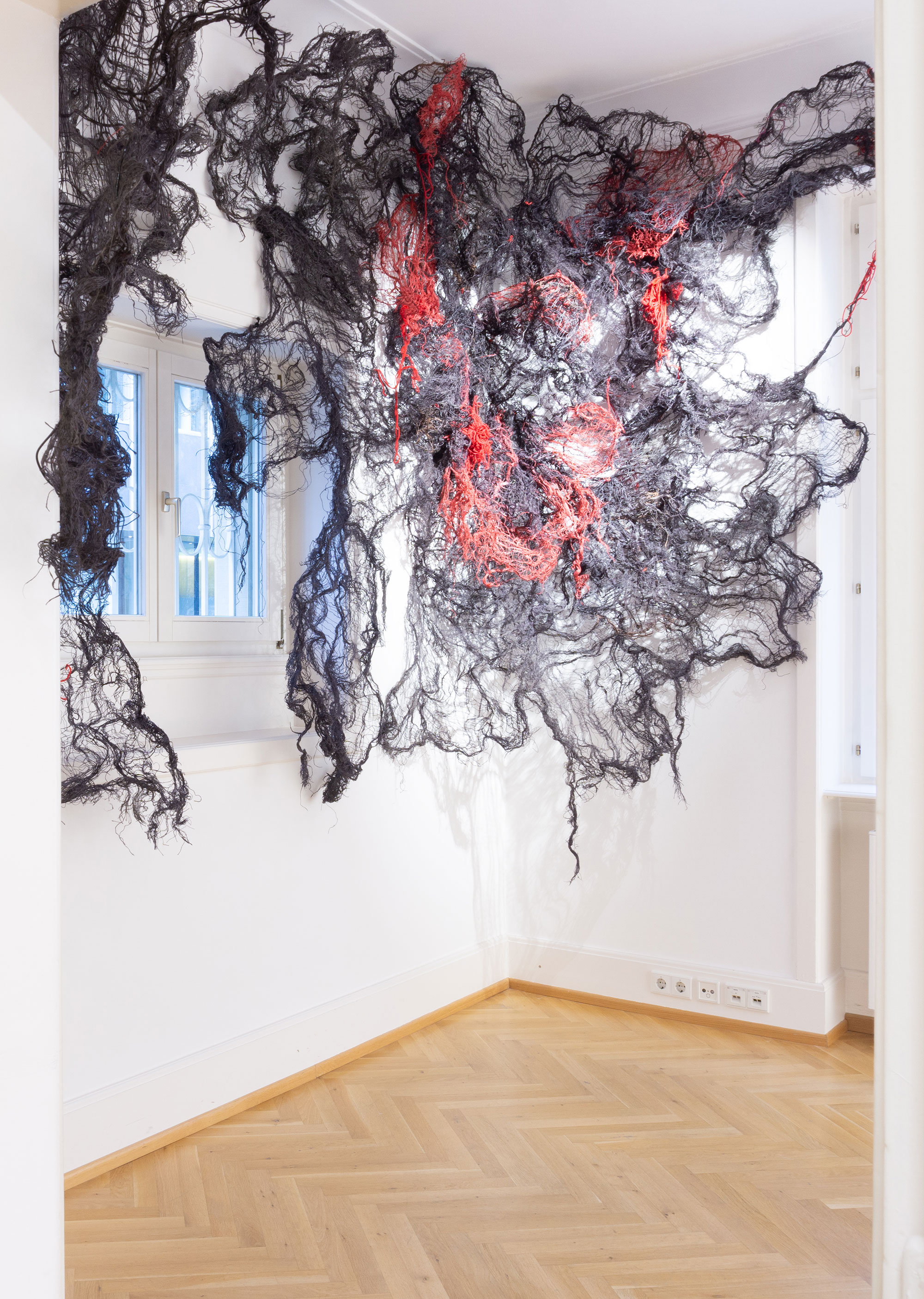 In ecological considerations, human interactions and relationships occur in concert with (for better or worse) the broader natural environment, in body, in mind - embodied. There is a gentle invitation to understand human beings as being part of (not apart from) nature, embodied in it, and that nature is itself an unyielding force that has the capacity to engulf, consume, and regenerate itself. Nnenna Okore’s wall-engulfing installation When All Is Said and Done is made from burlap, dye, wire, and yarn and the work explores and utilizes the inherent physicality, durability, and apparent fragility and flexibility of burlap and wire. The textured sculpture sprouts from the walls like an organism growing outward to meet the space, inviting the viewer to contemplate the passing of time, through growth, death, decay, and re-growth – perhaps mimicking life forms drawn from the viewer’s own memories and imagination. The two-part sprawling piece comprises of billowing waves of stretched natural fibre layeres shaped on a black wire frame, with root-like forms of swooping and entangled threads in hues of red, dark purple, and brown.