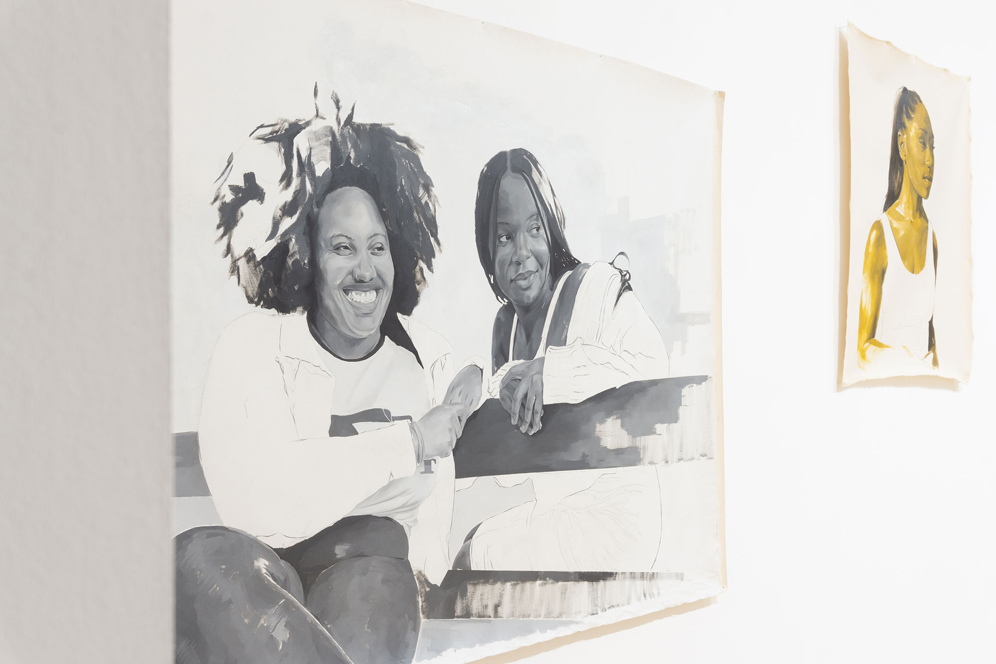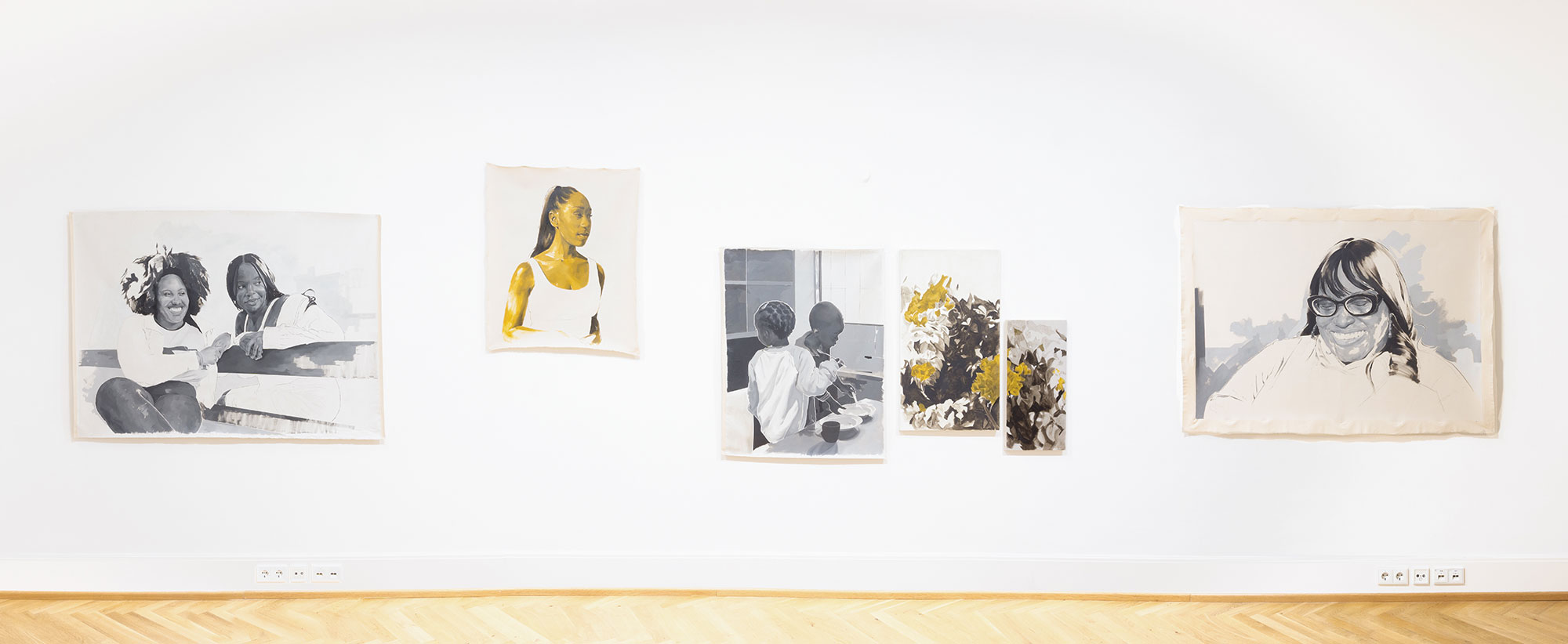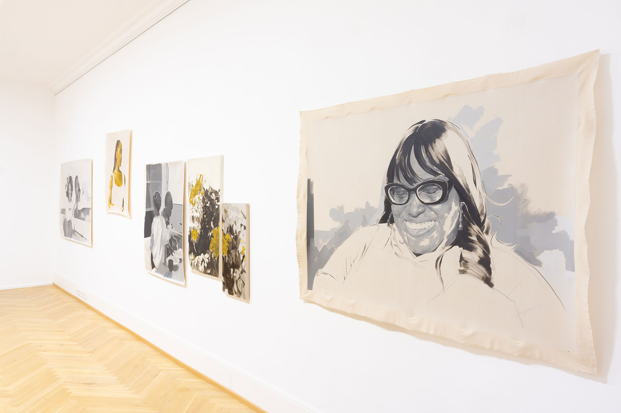 Louise Mandumbwa’s works in the exhibition are portraits of beloved friends and family members painted in oil but with the tenderness of a pencil or charcoal drawing, shown alongside a panel piece incorporating fragments of plant life, a nod to the gardens Mandumbwa recalls as home and featured in her poem "I am all the loves I have ever known." In the poem Mandumbwa speaks of her mother’s gardens – "That I remember the gardens she kept at each house we called home better than the rooms inside of them." The plants in the gardens and the gardens themselves not only form a part of home, but hold a space for a sensorial recollection, a memory of home that is both embodied and ephemeral.