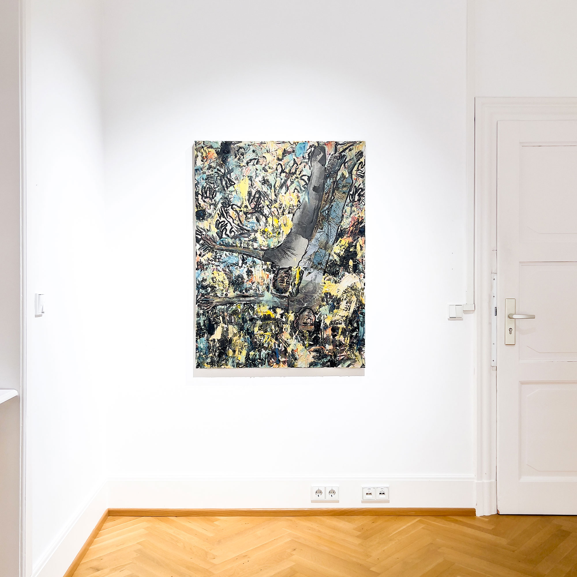 For this new solo show in Frankfurt, Mario Joyce created a body of work that focuses on genealogy and takes soil from the farm he grew up on in rural Ohio, mixing it with a dark base oil paint to create dense compositions in which abstracted figures made out of old archival photos from the region can be seen in motion: leaping, reaching, overlapping and visually embedded within the environment. Joyce developed this material alchemy with soil in his recently completed Pratt>FORWARD residency at New Lab in Brooklyn Navy Yard which was followed by an exhibition with UTA Artist Space in Atlanta, pushing his experimentation with soil as both living and historical matter and building it into his textured collage paintings.