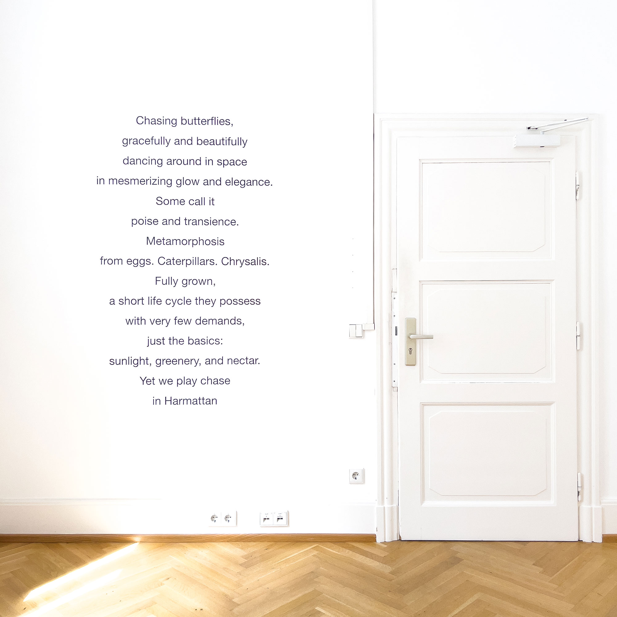 Chasing Butterflies in Harmattan aims to capture the sense of abnormality linked to climate change and global warming that has brought negative impacts to different biosystems around the world. For instance, some bird species have changed their nesting schedules, and others that depend on warm or cold temperatures have become extinct or switched their patterns of survival due to the unprecedented heat waves and flooding.