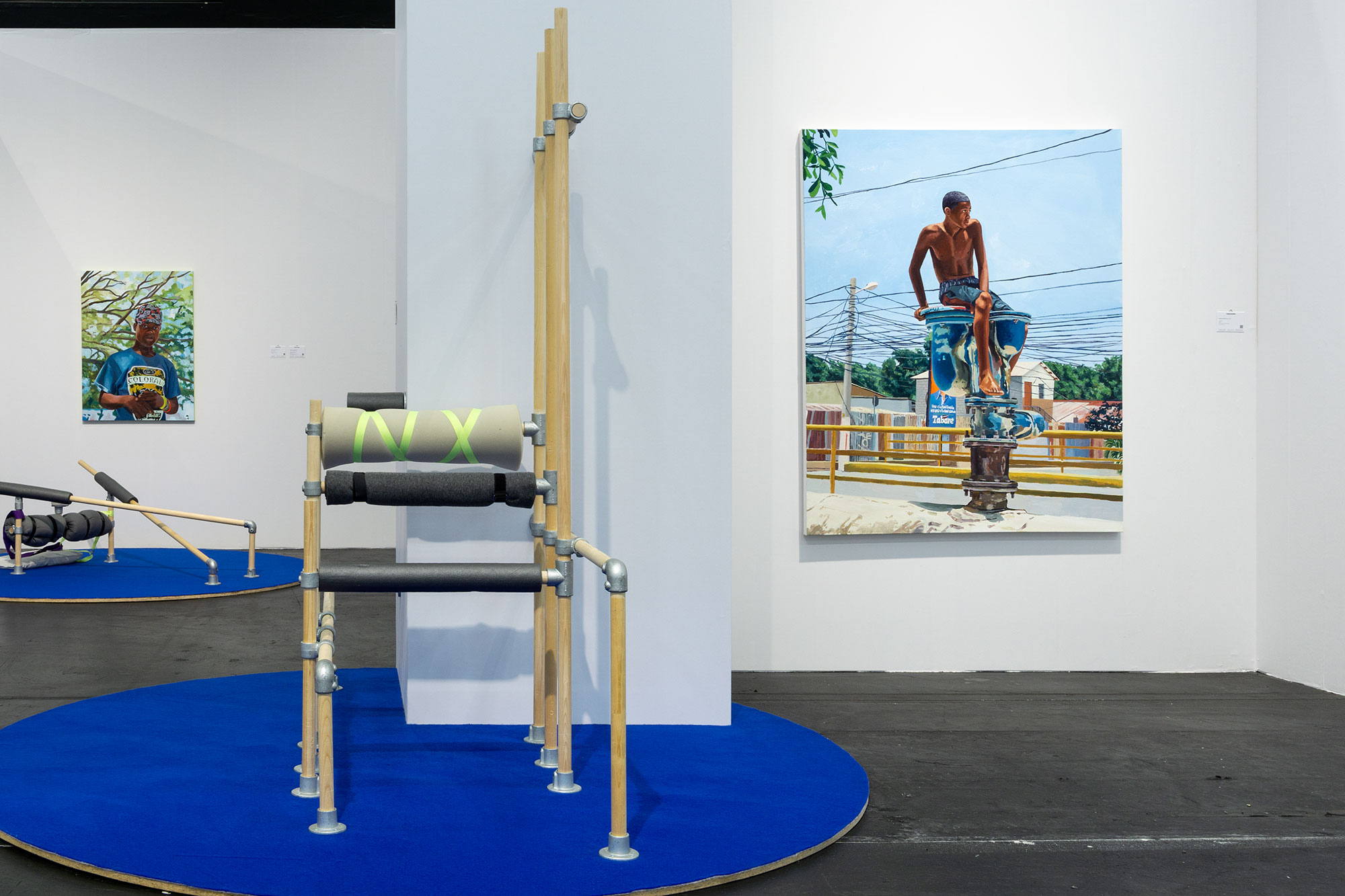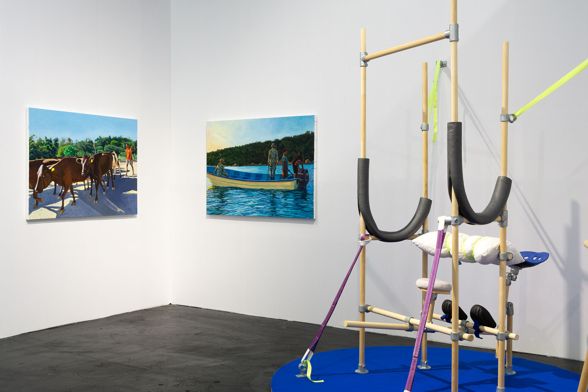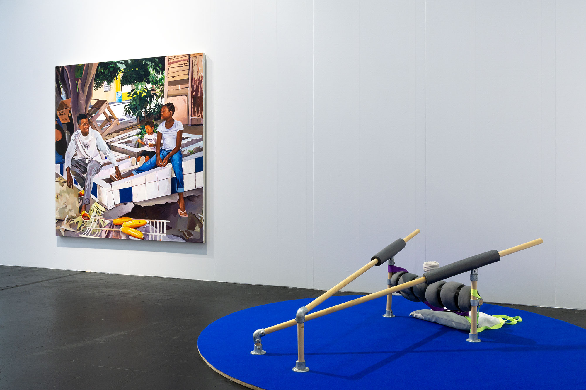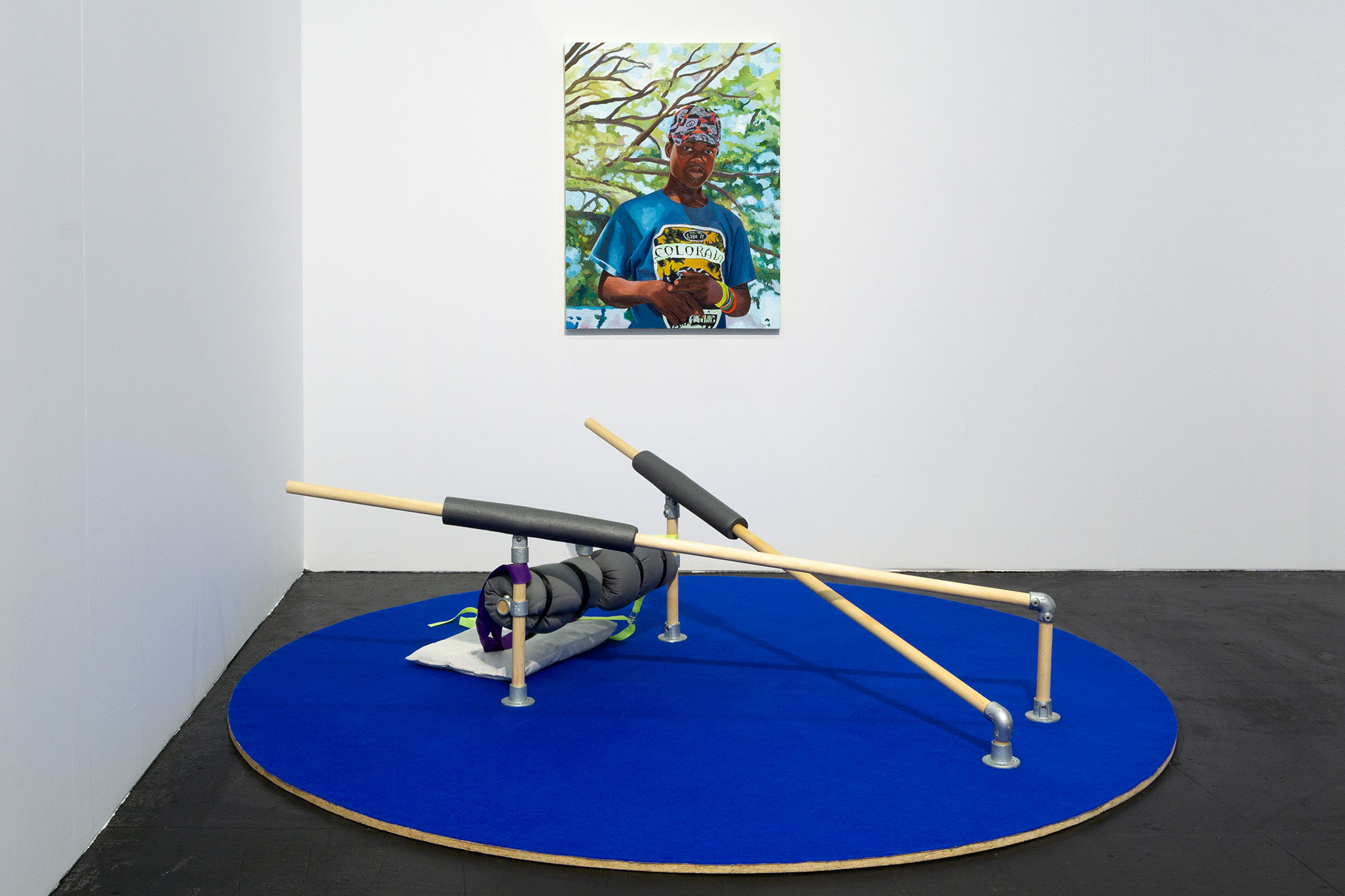 Four of the five sculptures that make up “Embracements” (2021) occupy the floor space of the booth, with the paintings by Vasquez sparsely placed on the walls. The sculptures are primarily grey and cobalt blue and are made from carpet, metal, foam, cushions, neon yellow tension straps, taking clues from gym materials like steel bars or plastic mats, with the paintings giving pops of color and outdoor views on the walls so that we cannot view exhaustion and restlessness without reflecting on moments of ease, and vice versa.